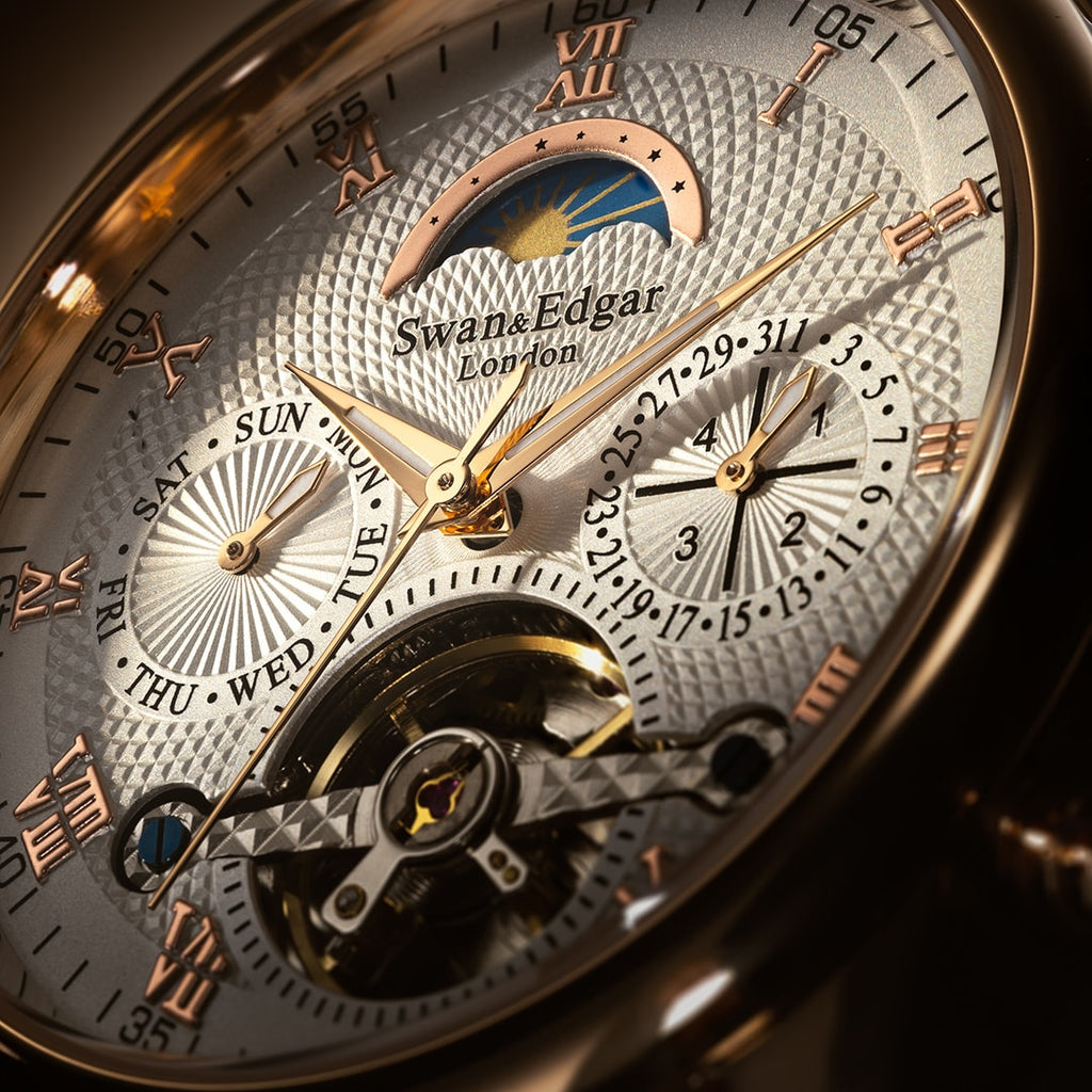 The polished stainless steel case is complemented by a sapphire crystal and a skeletonised case back, revealing the intricate movement within. Attention to detail extends to the serrated edge crown for ease of adjustment and a hand-waxed royal blue leather strap, finished with a Swan & Edgar-etched logo buckle, adding a refined touch to this understated, yet luxurious timepiece.