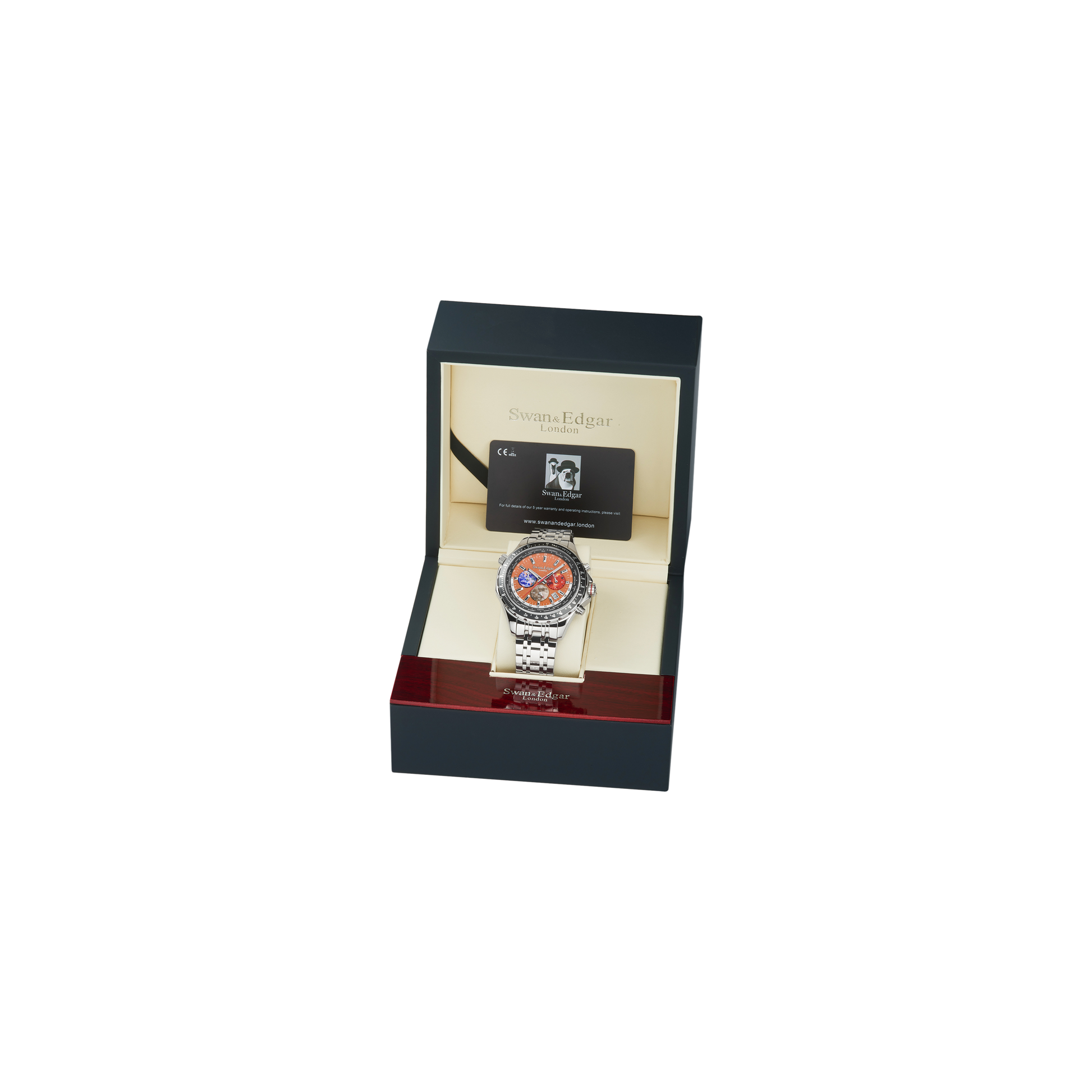 The polished stainless steel case is complemented by a sapphire crystal and a skeletonised case back, revealing the intricate movement within. Attention to detail extends to the serrated edge crown for ease of adjustment and a hand-waxed royal blue leather strap, finished with a Swan & Edgar-etched logo buckle, adding a refined touch to this understated, yet luxurious timepiece.